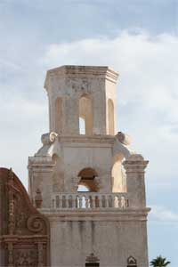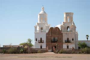History"White Dove of the Desert" for its brilliant white color,Southern Arizona into Northern Mexico. The Spanish called this stretch of desert and mountains the Pimeria Alta. Jesuit missionary-explorer, Father Eusebio Francisco Kino, founded these Spanish missions during his travels in the region, from 1683 to 1711, Father Kino arrived in the Tohono O'odham village of Wa:k ('Bac'), which is one of the largest, continuously inhabited settlements in the Americas, in 1692. nearby Santa Cruz River Kino founded a mission at Wa:k and began building a church in 1700. growing corn, squash and beans However, he died in 1711, leaving only the church foundation complete. After the Jesuits were expelled from New Spain in 1767, the Franciscans took over responsibility of the missions. began construction of the present church in 1783. San Xavier Mission is considered to be the finest example of Spanish mission architecture in the United States. Spanish, Moorish and Mexican Baroque design. adobe block coated with a plaster of lime, local sand and cactus juice. two bell towers, only one tower was completed. Why it was not finished remains a mystery close to 300 painted or sculpted angels, more than 100 images of saints and over a dozen representations of Santa Maria, mother of Christ. San Xavier Mission is still a fully functioning parish church and is still administered by the Franciscan friars. Constructed 1783-1797 by Tohono O'odham under Franciscan and Spanish direction. Restoration: The non-profit, non-sectarian corporation, the Patronato San Xavier raised funding for a major restoration of this most beautiful mission beginning 1989. Beginning in 1989 the brick vaulted roof was refinished with a breathing plaster skin of lime, sand, and nopal cactus mucilage. From 1992 to 1997 an international team of art conservators cleaned and stabilized the original Spanish Colonial mural paintings and statues in the interior. Restoration moved outside and underground. Drains were added and bricks were replaced. The exterior cement stucco that had been added earlier, and not the best material for adobe walls, was removed and repalced with a plaster of lime, sand, and cactus mucilage that allows moisture to excape from the adobe. Each tower will cost about $1.3 million and take two years. When this author first visited in 2009, one tower was complete and restoration was about to begin on the second as work progressed on the northwest corner. Donations can be sent to : Patronato San Xavier P.O. Box 522, Tucson, AZ 85702 |
