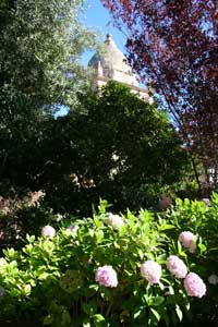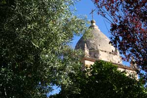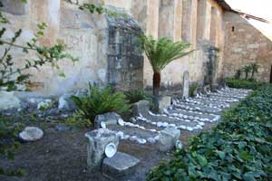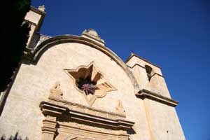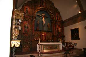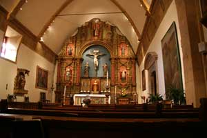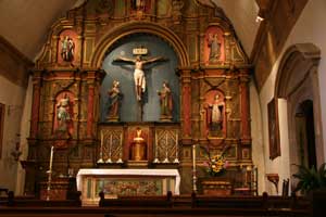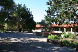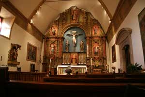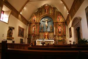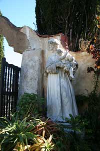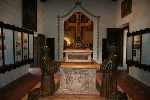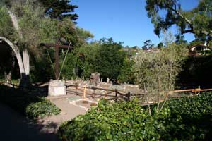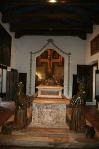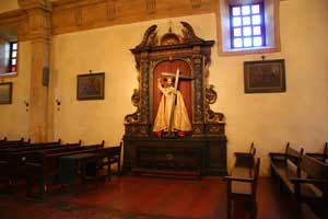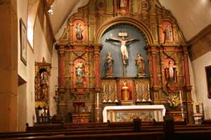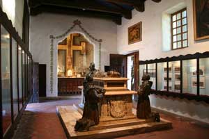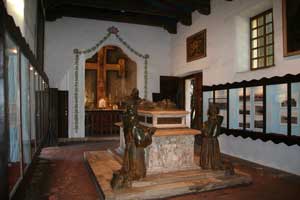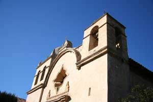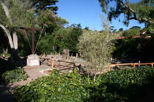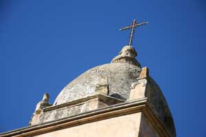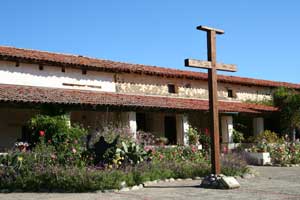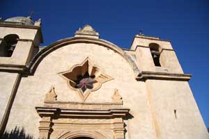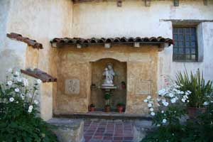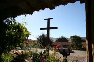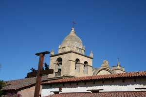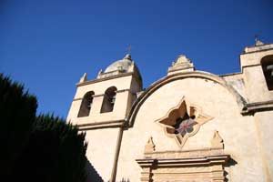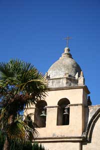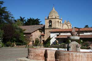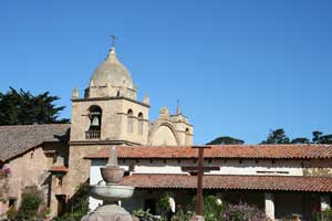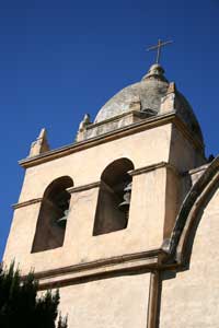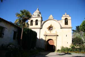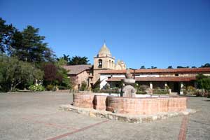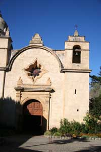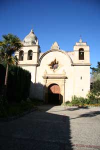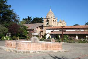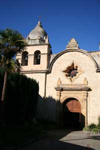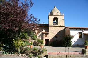 most, was the quadrangle where every door was of a different design. I hope to add photos from our recent visit soon and hope to return again in the fall. HistoryMission San Carlos Borromeo de Carmelo was founded on June 3, 1770 by Father Junipero Serra. It was the second mission established in Alto California. Located on the Monterey Peninsula, a short distance from the City of Monterey, itself, filled with historic sites.San Carlos Borromeo de Carmelo is considered by many to be the most beautiful of the California Missions. It served as Father Serra's headquarters and is where he was buried upon his death in 1784. Originally founded in Monterey, after a year the mission was moved to the Carmel Valley which was closer to the native population and better for agriculture. The church at Mission San Carlos Borromeo de Carmelo took four years to construct and was completed in 1797. It is one of only three stone mission churches in California. Other stone churches are at Mission San Juan Capistrano and Mission Santa Barbara. The church is unusual in that the walls taper inward forming a catenary arch rather than flat as was usual. The Moorish influenced bell tower has an outside stairway. With secularization, all the mission lands were sold off except the church site. The stone church was abandoned, collapsed in 1851, and stood roofless for 30 years. When a new roof was installed in 1884, the pitch was wrong and was not corrected until 1930. The mission became a parish church in 1933 and has been in the process of being restored since. Address and DirectionsRio RoadCarmel, California 93923 Mission San Carlos Borromeo de Carmelo is located at the south end of the small community with the long name, Carmel-by-the-Sea. Exit Highway 1 at Rio Road heading west. After about one mile, the mission is on the left. Mission San Carlos Borromeo de Carmelo is a few miles south of the historic city of Monterey. |