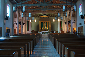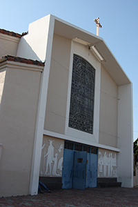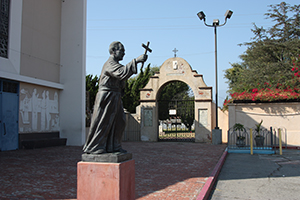 ![]() Exterior of the new church with statue in foreground and cemetery beyond. |
