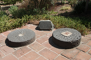![]() These volcanic Tufa mill stones were used in the upper level of the mill to mill grain. For many years they were lost until found on the grounds of Huntington Library and returned. |