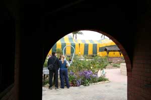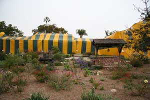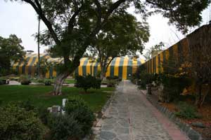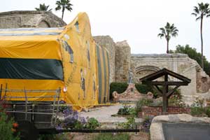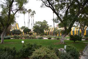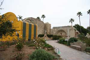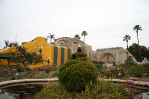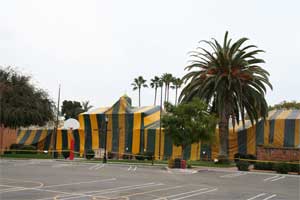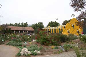![]() The returning Swallow made Mission San Juan Capistrano famous and are remembered in this decoration on a freeway sound wall as the Highway passes through the town. |