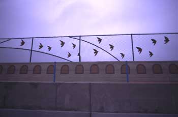 ![]() The returning Swallow made Mission San Juan Capistrano famous and are remembered in this decoration on a freeway sound wall as the Highway passes through the town. |
