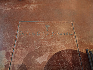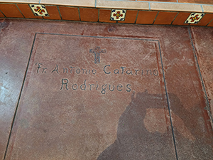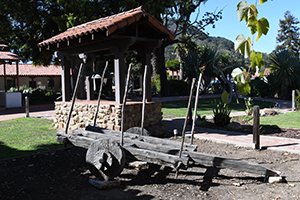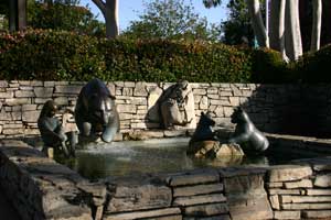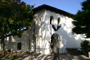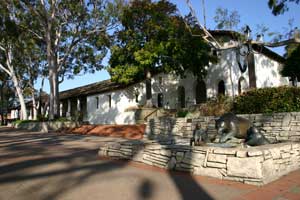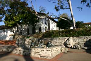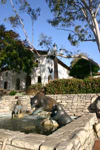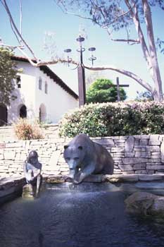 ![]() Sculpture of a Native girl and California grizzly bear in a plaza in front of the church.. |