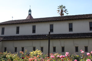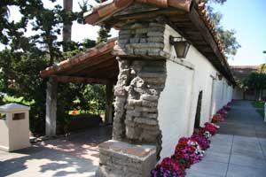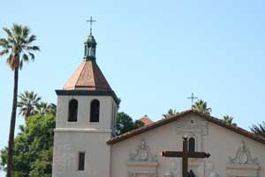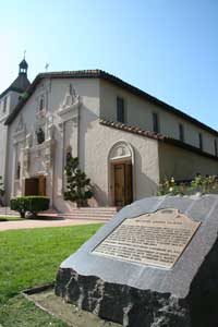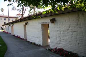 Mission Santa Clara de Asis was founded January 12, 1777 by Father Junipero Serra and eventualy grew into Santa Clara College, the first University in California. The mission is now within the Santa Clara College campus. Little of the original mission survives. As you enter the campus on the east through the main gate on The Alameda, Highway 82, notice the cross to the right. Pass the information booth and you will see the final mission church ahead. Turn right at the first small street and right again into the parking lot where parking is free on the weekend. Walk back to the cross by the entrance. Laid out in stone on the ground is the outline of an earlier church. The outline actually extends beyond into a bordering cul-de-sack. Then walk back to the final church. This final church is one of the largest mission churches surviving and still in daily use. To the south (left) you will find some garden areas and the partially intact remains of a wall and colonnade. Follow this to the last remaining adobe structure that I could find, besides the church. |