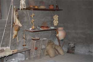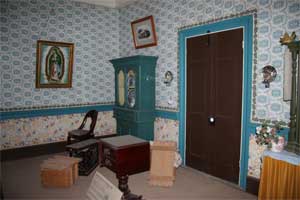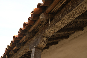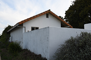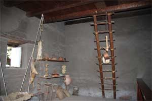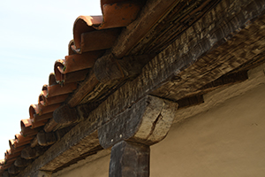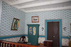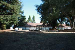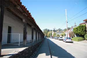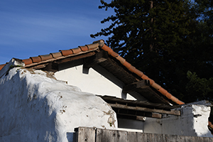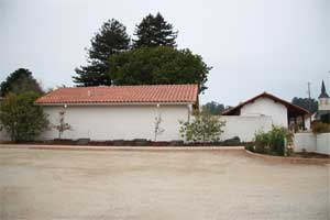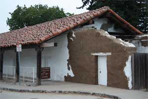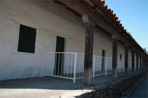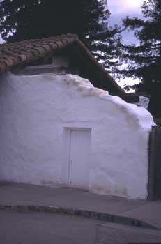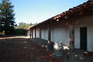 This building originally contained 17 rooms for family housing. Seven room remain. This is the oldest family housing building remaining in California. A similar building once existed about 200 feet north. The reproduction mission is midway between what would be the far end of these buildings if they existed. |