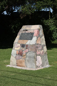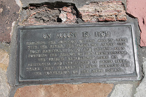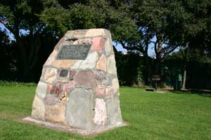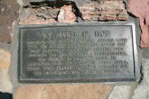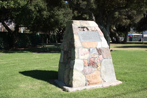 The plaque reads: "On August 13, 1769* Reaching the junction of the Arroyo Mupu with the river, the place was named the Holy Marters, Ipolito and Casiano. Upon founding the Mission San Buenaventura, the priests established here an Asistencia and christened it Santa Paula, where they frequently held sevices for the conversion of the Mupu Indians." *This was the year of founding the first Mission in Alta California, San Diego. It seems this is the year of the first expedition, not the founding of the Asistencia. San Buenaventura was founded in 1782. |