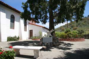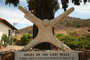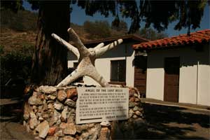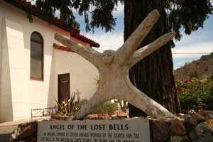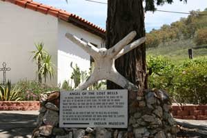 Angel of the Lost Bells An original carving by Steven Berardi inspired by the search for the lost bells of the mission of Santa Ysabel. The Padre and the Indians brought two bells 150 years ago for six burro load of barley. The oldest bells in California made in 1723 and 1767. In 1926 the bells mysteriously disappeared. The Mission has not given up hope that the bells will be returned. The day after the bells disappeared Jose Maria Osuna found the clappers. They were returned in 1959 and are now kept in the Indian Museum. |