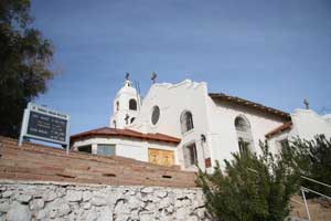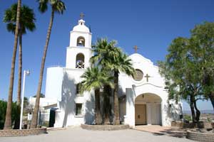 The first mission at Ft. Yuma was named Puerto de la Purísima Concepción, established in 1780, built by Father Francisco Garcés. The mission/pueblo site was inadequately supported. Colonists ignored Indian rights, usurped the best lands, and destroyed Indian crops. Completely frustrated and disappointed, the Quechans (Yumas) and their allies destroyed Concepción on July 17-19, 1781. On July 17, 1781, the Spanish Padres, settlers, and soldiers at that place and at San Pedro y San Pablo de Bicuner, 8 leagues up the Colorado river, were all massacred. Fort Yuma (1849-1885) became a U.S. military outpost in the 19th century and was revived as an active mission again in 1919. The current church, St. Thomas Indian Mission, was dedicated in 1923. The Mission was located on the California side of the Colorado River near where the Gila River joins the Colorado on Indian Hill. Times Open: The mission is closed during the week, but staff will accept visitors who make arrangements beforehand by calling (760) 572-0283. The mission is San Diego's eastern-most parish. Mass times are Sat. 4:30 and Sun. 9:30 a.m. June-Sept., otherwise 10:30 a.m. Reconciliation is Saturday 3:30-4:30 p.m. Although the Mission is in California and on Pacific Time, because of its proximity to Yuma, it generally operates on Mountain Standard Time. California Historical Landmark No. 350. In the forcourt of the church is a statute of Padre Garcés. Location: St. Thomas Indian Mission, Indian Hill on Picacho Rd, Fort Yuma, 1 mi S of Winterhaven Location: St. Thomas Indian Mission is at Fort Yuma, California at the extreme southeast corner of California. Fort Yuma, California, Colorado River's west bank, opposite the present city of Yuma, Arizona. Take Interstate 8 almost to the Arizona border. After the check station, turn off on Winterhaven. Turn left on 4th Ave. When you come to a sign that reads "To Bard," turn right. At the fork in the road, go right. Turn left at the dead end and you will come to the church. It's actually easier than these directions sound. From the Arizona side, cross the Ocean to Ocean bridge and turn right. And there it is. It's on top of the only hill in the area and easily visible from a distance. |