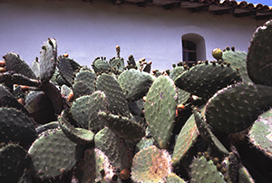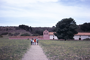 ![]() The path from the parking lot. You pass between the trees and the Mission extends beyond. Photo date: 4-4-92. |