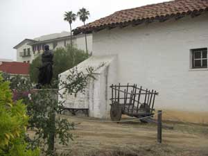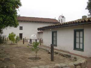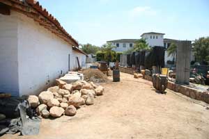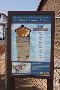 | My wife and I had been visiting the mission and related constructions in Santa Barbara in September of 2003 and were tired as we left for home. The last Spanish construction we saw in Santa Barbara was the Santa Barbara Royal Presidio, on the way out of town. Two streets breach the restored wall of the Presideo with an intersection toward one corner of the parade grounds. A quick look and we promised ourselves that we would stop the next time. We kept that promise on a Saturday in May of 2004 when El Presidio de Santa Barbara State Historic Park was our primary destination. We spent several hours exploring the three pieces of the restored adobe Presidio and the adjacent Commander's home. Restoration is continuing, so we plan to return every few years. We visited it again briefly a few months later as part of the Red Tile Walking Tour of historic Santa Barbara. It was many years before I returned, on May 15, 2010 to help make adobe bricks for the restoration of the west corner outer wall. |