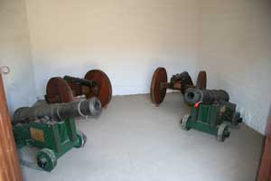 | Cannon Display. Two cannons (back in left image, left in right image) are reproductions of the Presidio cannons, used for defense. The original cannons had a 1.5 inch bore and a 36 inch barrel of bronze firing a 4 pound ball and were of British manufacture. Two cannons (forward in left image, right in right image) are Cannon 'C' and Cannon 'D' found in the sand along the beach of Goleta Beach Park after a storm in 1982. The five cannons found may be from the Spanish ship Dorotea which grounded in 1829 and was refloated a year later. These two guns have a 3.3 inch bore and a length of 54.25 inches, weighing 625 pounds and fired a 4 pound ball. The guns were restored. | |