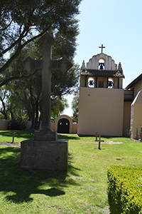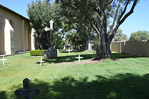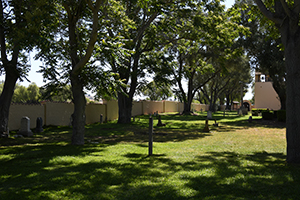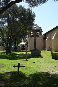 Church at right, campanile in the distance, cemetery to the left.