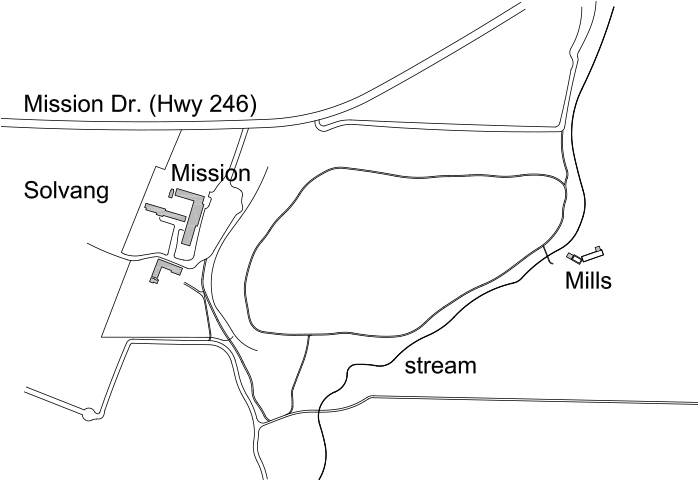 Unfortunately, the Mission Santa Ines grist mills are not visible from Mission Santa Ines and are not generally open to the public. I do not want to discourage you from visiting the mills. See the map below and be prepared to hike. There are no facilities. Or, enjoy these slides. |